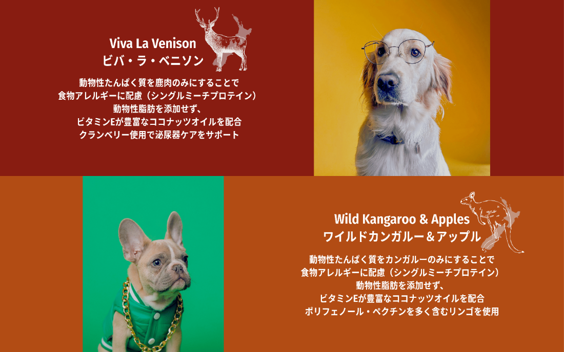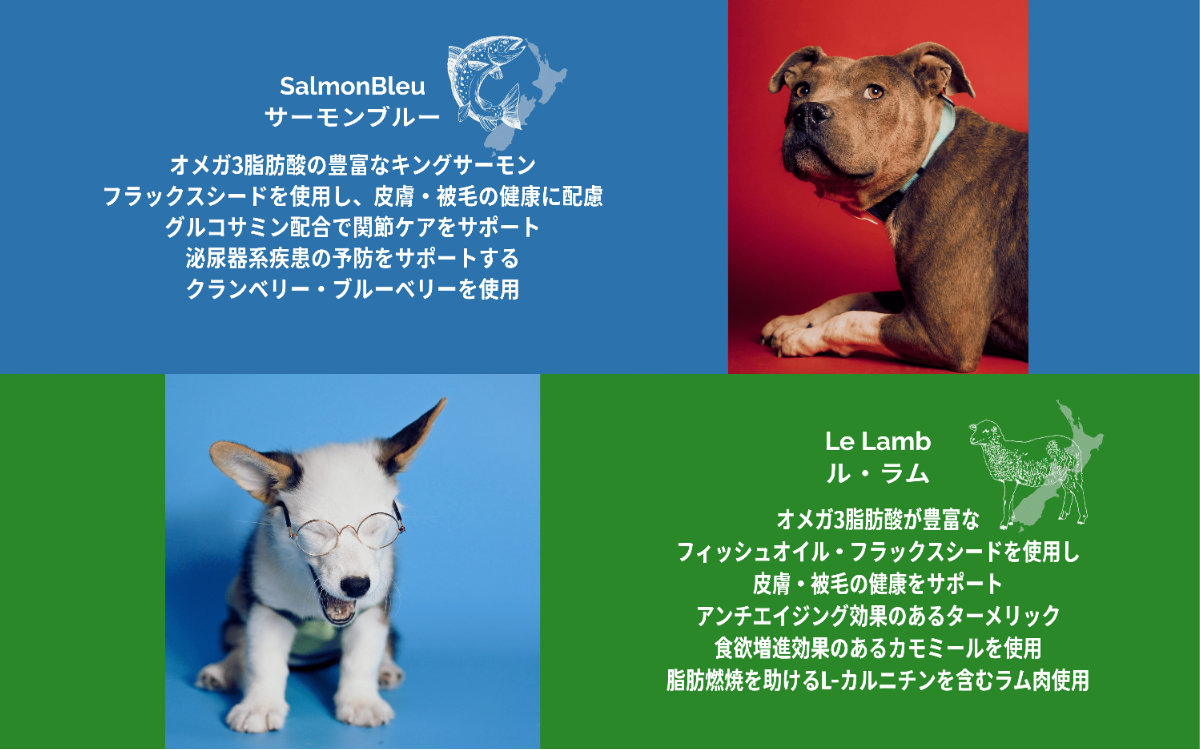 | カンガルー生肉、ドライカンガルー肉、グリーンピース、タピオカ、ココナッツオイル、フラックスシード、アップル、醸造用酵母、エンドウ豆タンパク、ナチュラルフレーバー、イエローピース、ビネガー、シーソルト、塩化カリウム、硫酸マグネシウム、塩化コリン、タウリン、DL-メチオニン、炭酸カルシウム、亜鉛アミノ酸複合体、鉄アミノ酸複合体、ビタミンE、ナイアシン、銅アミノ酸複合体、d-パトテン酸カルシウム、マンガンアミノ酸複合体、亜セレン酸ナトリウム、リボフラビン、硝酸チアミン、ビタミンB12、ビタミンA、塩酸ピリドキシン、硫酸コバルト、ヨウ素酸カルシウム、葉酸、ビタミンD3、ローズマリーエキス、緑茶エキス、スペアミントエキス、酸化防止剤(ミックストコフェロール) | 鹿生肉、ドライ鹿肉、グリーンピース、タピオカ、ココナッツオイル、エンドウ豆タンパク、フラックスシード、醸造用酵母、ナチュラルフレーバー、イエローピース、ビネガー、シーソルト、塩化カリウム、硫酸マグネシウム、塩化コリン、ドライクランベリー、ドライアップル、ドライほうれん草、ブルーベリー、ドライケルプ、タウリン、DL-メチオニン、炭酸カルシウム、亜鉛アミノ酸複合体、鉄アミノ酸複合体、ビタミンE、ナイアシン、銅アミノ酸複合体、d-パントテン酸カルシウム、マンガンアミノ酸複合体、亜セレン酸ナトリウム、リボフラビン、硝酸チアミン、ビタミンB12、ビタミンA、塩酸ピリドキシン、硫酸コバルト、ヨウ素酸カルシウム、葉酸、ビタミンD3、ローズマリーエキス、緑茶エキス、スペアミントエキス、酸化防止剤(ミックストコフェロール) | 生サーモン、ドライサーモン、オーシャンフィッシュミール、グリーンピース、タピオカ、鶏脂肪、イエローピース、ポテト、フラックスシード、醸造用酵母、ビネガー、クランベリー、ケルプパウダー、ほうれん草パウダー、ブルーベリー、ナチュラルフレーバー、エンドウ豆タンパク、シーソルト、塩化カリウム、硫酸マグネシウム、塩化コリン、タウリン、DL-メチオニン、炭酸カルシウム、亜鉛アミノ酸複合体、鉄アミノ酸複合体、ビタミンE、ナイアシン、銅アミノ酸複合体、d-パントテン酸カルシウム、マンガンアミノ酸複合体、亜セレン酸ナトリウム、リボフラビン、硝酸チアミン、ビタミンB12、ビタミンA、塩酸ピリドキシン、硫酸コバルト、ヨウ素酸カルシウム、葉酸、ビタミンD3、グルコサミン塩酸塩、ローズマリーエキス、緑茶エキス、スペアミントエキス、酸化防止剤(ミックストコフェロール) | ラム生肉、ドライラム肉、オーシャンフィッシュミール、グリーンピース、タピオカ、ポテト、イエローピース、鶏脂肪、フラックスシード、醸造用酵母、ナチュラルフレーバー、ビネガー、シーソルト、フィッシュオイル、ドライクランベリー、ドライブルーベリー、ターメリック、カモミール、ペパーミント、塩化カリウム、硫酸マグネシウム、塩化コリン、タウリン、DL-メチオニン、炭酸カルシウム、亜鉛アミノ酸複合体、鉄アミノ酸複合体、ビタミンE、ナイアシン、銅アミノ酸複合体、d-パントテン酸カルシウム、マンガンアミノ酸複合体、亜セレン酸ナトリウム、リボフラビン、硝酸チアミン、ビタミンB12、ビタミンA、塩酸ピリドキシン、硫酸コバルト、ヨウ素酸カルシウム、葉酸、ビタミンD3、ローズマリーエキス、緑茶エキス、スペアミントエキス、酸化防止剤(ミックストコフェロール) | ||||||||||||