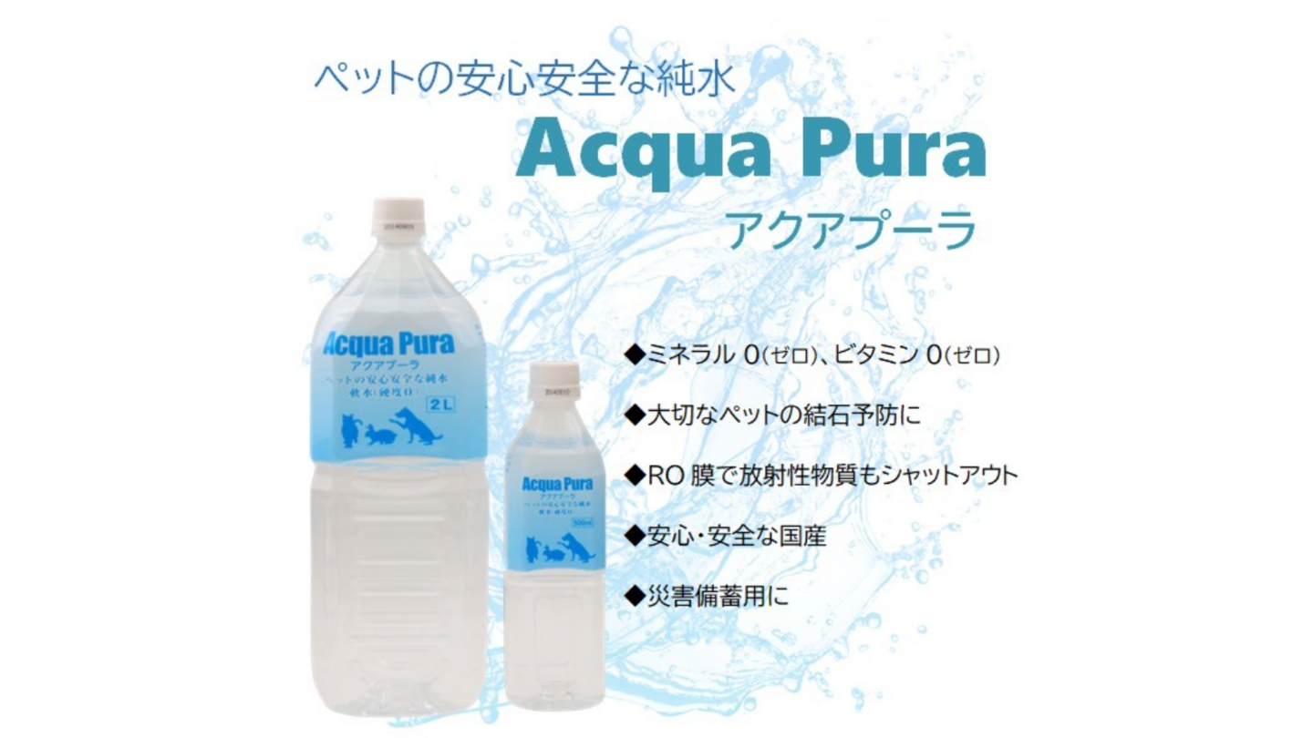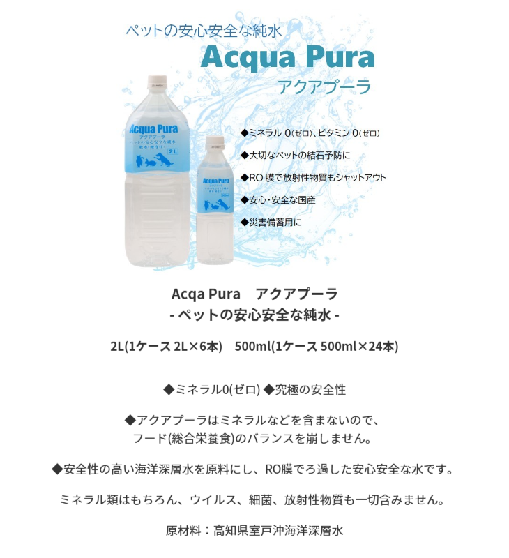 HOME | ブリーダーパック Acqa Pura アクアプーラ - ペットの安心安全な純水 - 2L(1ケース 2L×6本) 500ml(1ケース 500ml×24本)◆ミネラル0(ゼロ) ◆究極の安全性 ◆アクアプーラはミネラルなどを含まないので、フード(総合栄養食)のバランスを崩しません。 ◆安全性の高い海洋深層水を原料にし、RO膜でろ過した安心安全な水です。 ミネラル類はもちろん、ウイルス、細菌、放射性物質も一切含みません。 原材料:高知県室戸沖海洋深層水