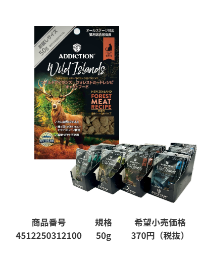 | 鹿生肉、鹿生ハート、鹿生トライプ、ドライ鶏肉、ドライビーフ肉、全卵、エンドウ豆、醸造用酵母、エンドウ豆タンパク、フラックスシード、緑イ貝、マヌカハニー、キウイフルーツ、牛脂肪、タピオカ、天然フレーバー、そら豆、ビネガー、塩化コリン、タウリン、DL-メチオニン、亜鉛アミノ酸複合体、鉄アミノ酸複合体、炭酸カルシウム、ナイアシン(ビタミンB3)、ビタミンE、銅アミノ酸複合体、マンガンアミノ酸複合体、硝酸チアミン(ビタミンB1)、d-パントテン酸カルシウム(ビタミンB5)、亜セレン酸ナトリウム、リボフラビン、塩酸ピリドキシン(ビタミンB6)、ビタミンA、ビオチン、ビタミンB12、硫酸コバルト、葉酸、ヨウ素酸カルシウム、ビタミンK1、ビタミンD3 、ローズマリーエキス、緑茶エキス、スペアミントエキス、酸化防止剤(ミックストコフェロール) | ラム生肉、ビーフ生肉、ラム生レバー、ビーフ生トライプ、ドライビーフ肉、ドライ鶏肉、エンドウ豆、全卵、エンドウ豆タンパク、フラックスシード、緑イ貝、マヌカハニー、キウイフルーツ、そら豆、タピオカ、牛脂肪、醸造用酵母、天然フレーバー、ビネガー、塩化カリウム、塩化コリン、タウリン、DL-メチオニン、亜鉛アミノ酸複合体、鉄アミノ酸複合体、炭酸カルシウム、ナイアシン(ビタミンB3)、ビタミンE、銅アミノ酸複合体、マンガンアミノ酸複合体、硝酸チアミン(ビタミンB1)、d-パントテン酸カルシウム(ビタミンB5)、亜セレン酸ナトリウム、リボフラビン、塩酸ピリドキシン(ビタミンB6)、ビタミンA、ビオチン、ビタミンB12、硫酸コバルト、葉酸、ヨウ素酸カルシウム、ビタミンK1、ビタミンD3、ローズマリーエキス、緑茶エキス、スペアミントエキス、酸化防止剤(ミックストコフェロール) | 生サーモン、生サバ、生ホキ、オーシャンフィッシュミール、ドライ鶏肉、エンドウ豆、全卵、エンドウ豆タンパク、タピオカ、鶏脂肪、フラックスシード、緑イ貝、マヌカハニー、キウイフルーツ、醸造用酵母、天然フレーバー、そら豆、ビネガー、塩化カリウム、塩化コリン、タウリン、DL-メチオニン、亜鉛アミノ酸複合体、鉄アミノ酸複合体、炭酸カルシウム、ナイアシン(ビタミンB3)、ビタミンE、銅アミノ酸複合体、マンガンアミノ酸複合体、硝酸チアミン(ビタミンB1)、d-パントテン酸カルシウム(ビタミンB5)、亜セレン酸ナトリウム、リボフラビン、塩酸ピリドキシン(ビタミンB6)、ビタミンA、ビオチン、ビタミンB12、硫酸コバルト、葉酸、ヨウ素酸カルシウム、ビタミンK1、ビタミンD3、ローズマリーエキス、緑茶エキス、スペアミントエキス、酸化防止剤(ミックストコフェロール) | 鶏生肉、鴨生肉、七面鳥生肉、鶏生レバー、ドライ鶏肉、全卵、エンドウ豆、フィッシュミール、そら豆、エンドウ豆タンパク、フラックスシード、緑イ貝、マヌカハニー、キウイフルーツ、タピオカ、鶏脂肪、醸造用酵母、天然フレーバー、ビネガー、塩化コリン、塩化カリウム、タウリン、DL-メチオニン、亜鉛アミノ酸複合体、鉄アミノ酸複合体、炭酸カルシウム、ナイアシン(ビタミンB3)、ビタミンE、銅アミノ酸複合体、マンガンアミノ酸複合体、硝酸チアミン(ビタミンB1)、d-パントテン酸カルシウム(ビタミンB5)、亜セレン酸ナトリウム、リボフラビン、塩酸ピリドキシン(ビタミンB6)、ビタミンA、ビオチン、ビタミンB12、硫酸コバルト、葉酸、ヨウ素酸カルシウム、ビタミンK1、ビタミンD3、ローズマリーエキス、緑茶エキス、スペアミントエキス、酸化防止剤(ミックストコフェロール) | ||||||||